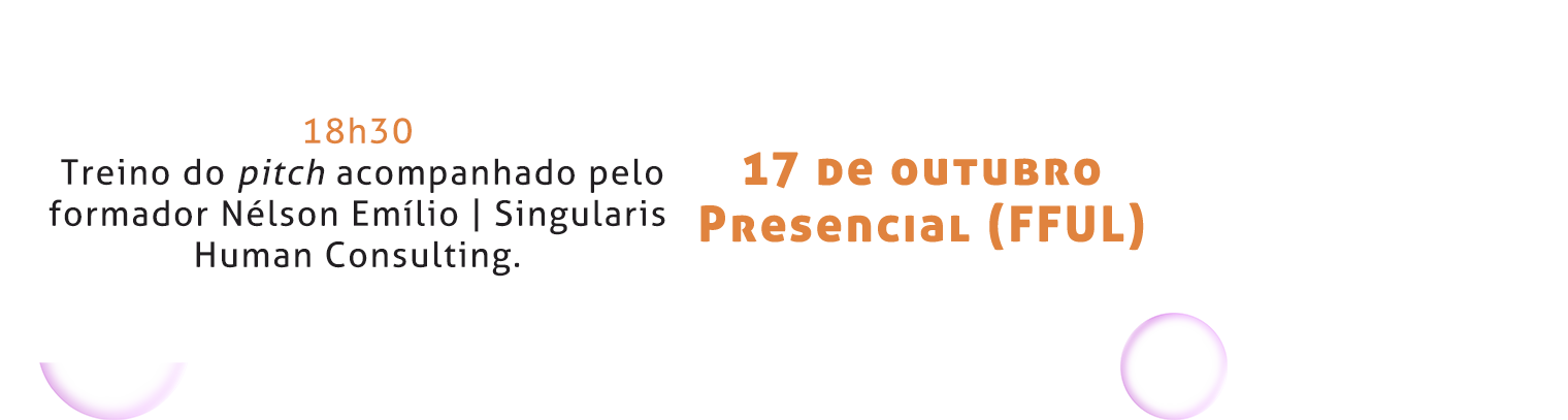• No dia 17 de outubro, quinta-feira, terás a oportunidade de treinar o teu pitch com o formador, presencialmente na FFUL, a partir das 19h;